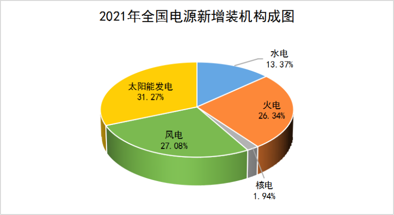 2021年,全國(guó)水電、火電、核電、風(fēng)電、光伏的裝機(jī)容量分別新增2349、4628、340、4757和5493萬(wàn)千瓦,合計(jì)17629萬(wàn)千瓦。