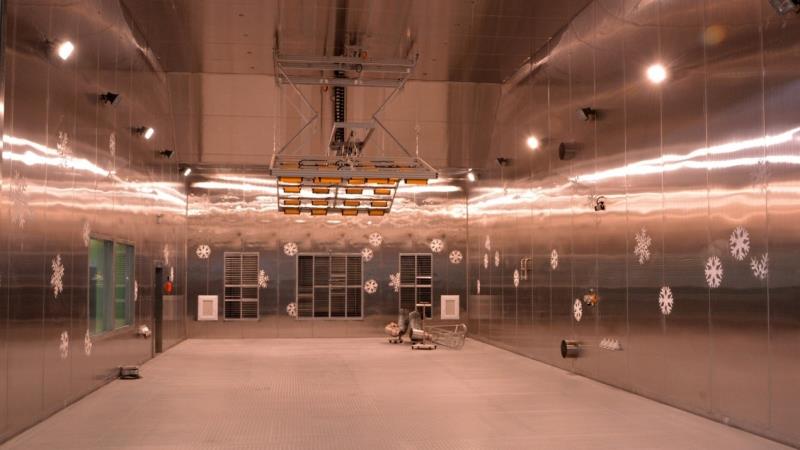坐落在同一個(gè)工業(yè)園的熱環(huán)境實(shí)驗(yàn)艙總?cè)莘e為880立方米(20x8x5.5m 長(zhǎng)x寬x高),為國(guó)內(nèi)最大的單體熱管理系統(tǒng)測(cè)試設(shè)施,可以裝載整個(gè)40英尺的集裝箱儲(chǔ)能機(jī)組,準(zhǔn)確控制-40至+60℃的內(nèi)部環(huán)境溫度,模擬嚴(yán)苛的戶外環(huán)境條件,測(cè)試電池環(huán)境的控制效果,電池組在高溫時(shí)的安全,在寒冬時(shí)的衰減和表現(xiàn)。