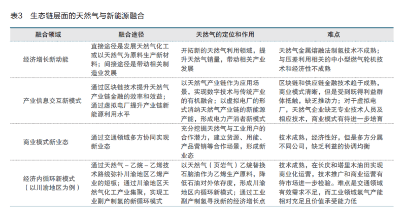 天然氣與新能源的生態(tài)鏈層面融合,是指天然氣突破現(xiàn)有的商業(yè)生態(tài)和盈利模式,發(fā)掘新的潛力,提供新的產(chǎn)品和服務(wù),在促進(jìn)碳中和方面發(fā)揮新的作用,主要體現(xiàn)在經(jīng)濟(jì)增長新動能、產(chǎn)業(yè)信息交互新模式、商業(yè)模式新業(yè)態(tài)、經(jīng)濟(jì)內(nèi)循環(huán)新模式幾個方面(見表3)。
