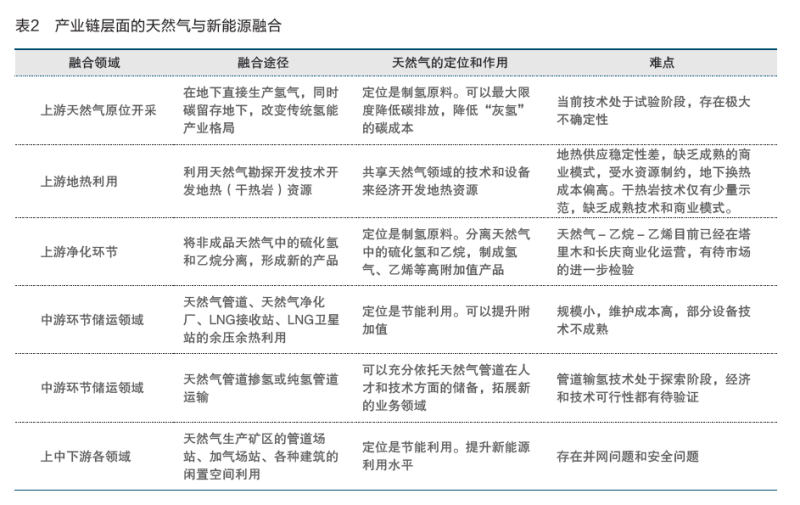 天然氣與新能源在產(chǎn)業(yè)鏈層面的融合,是指在天然氣生產(chǎn)、運(yùn)輸、儲存等環(huán)節(jié)與其他能源產(chǎn)品融合,突破天然氣產(chǎn)業(yè)只在終端銷售環(huán)節(jié)價值變現(xiàn)的局限,拓寬盈利渠道,提升全產(chǎn)業(yè)鏈盈利水平。主要集中在上游勘探開發(fā)環(huán)節(jié)的地?zé)衢_發(fā),地下原位開采(地下氫氣生產(chǎn)),中間環(huán)節(jié)的余壓余熱資源利用,中間產(chǎn)品利用(硫化氫制氫)、天然氣乙烷分離制乙烯以及閑置資源利用(光伏發(fā)電)等領(lǐng)域(見表2)。