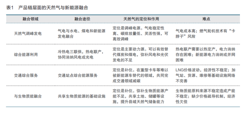天然氣與新能源在產(chǎn)品鏈層面的融合,是指天然氣與多種能源產(chǎn)品互補(bǔ),開拓單一能源產(chǎn)品無法高效開發(fā)的潛在市場,主要集中在電力領(lǐng)域的天然氣調(diào)峰發(fā)電、工業(yè)領(lǐng)域的綜合能源利用、交通領(lǐng)域的“油氣電氫服”綜合能源站建設(shè)和生物質(zhì)能幾個方面(見表1)。