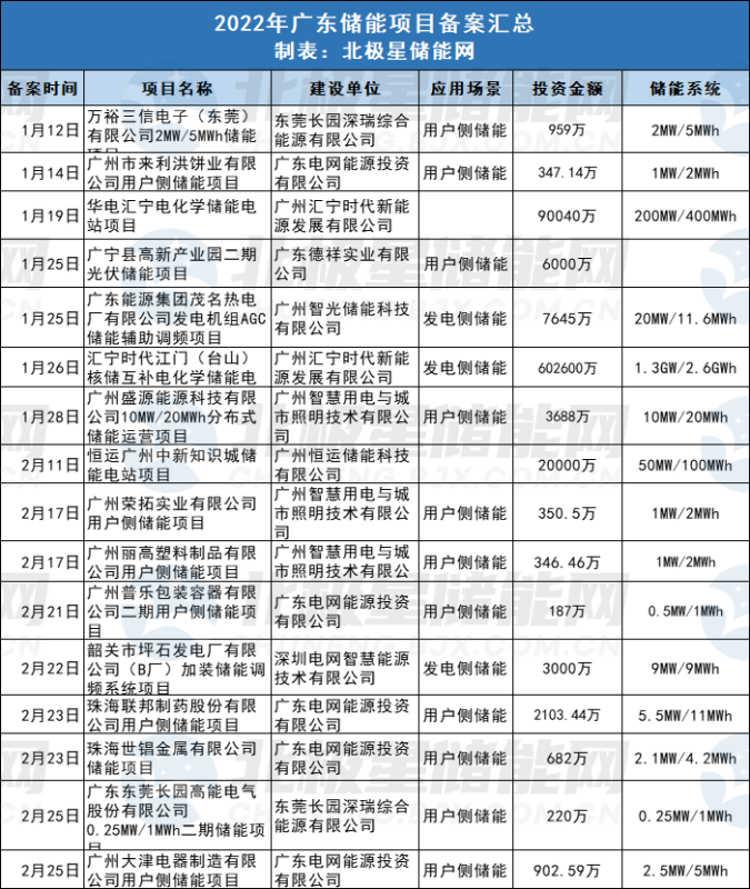 據(jù)北極星儲能網(wǎng)不完全統(tǒng)計,廣東省從2022年1月1日截止至今,已有16個儲能項目通過備案,儲能投資金額超73億,儲能總規(guī)模超1.6GW/3.1GWh。其中匯寧時代江門(臺山)核儲互補(bǔ)電化學(xué)儲能電站項目規(guī)模最大,達(dá)1.3GW/2.6GWh ,據(jù)了解該項目建成后將是全球單體最大的電化學(xué)儲能電站。