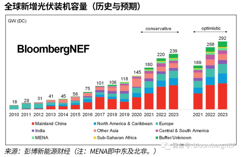 我們目前預(yù)計(jì)2021年新增的光伏裝機(jī)容量達(dá)到184GW(直流側(cè)),該數(shù)值在2022年將上升至245GW(直流側(cè)),創(chuàng)下新紀(jì)錄。