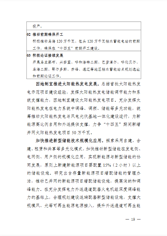 該規(guī)劃指出,積極推進(jìn)抽水蓄能電站開發(fā)建設(shè)。統(tǒng)籌電網(wǎng)安全穩(wěn)定運(yùn)行和新能源高效消納需求,結(jié)合全國抽水蓄能中長期發(fā)展規(guī)劃,按照投產(chǎn)一批、開工一批、謀劃一批的思路,統(tǒng)籌做好自治區(qū)抽水蓄能電站規(guī)劃建設(shè)。加快推進(jìn)赤峰芝瑞 120 萬千瓦抽水蓄能電站建設(shè),做好安全管理,力爭早日建成投產(chǎn)。早日開工烏海120萬千瓦、包頭120萬千瓦抽水蓄能電站, 確保在“十四五”前期開工建設(shè)。根據(jù)電網(wǎng)安全穩(wěn)定和新能源消納需要,開展烏蘭察布、興安盟、呼和浩特二期、巴彥淖爾、呼倫貝爾、烏海二期、鄂爾多斯、赤峰、通遼等地區(qū)抽水蓄能站點(diǎn)規(guī)劃選址和前期論證工作。因地制宜推動一批中小型抽水蓄能電站選點(diǎn)工作,就地提升局域電網(wǎng)調(diào)節(jié)支撐能力。