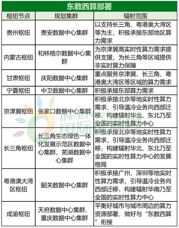 中國儲能網(wǎng)訊:近日,國家發(fā)展改革委、中央網(wǎng)信辦、工業(yè)和信息化部、國家能源局日前聯(lián)合印發(fā)通知,同意在京津冀、長三角、粵港澳大灣區(qū)、成渝、內(nèi)蒙古、貴州、甘肅、寧夏等8個地方啟動建設(shè)國家算力樞紐節(jié)點,并規(guī)劃了10個國家數(shù)據(jù)中心集群。這也是繼“西電東送”(開始于20世紀(jì)70年代)、“西氣東輸”(2000年2月批準(zhǔn)啟動)、“南水北調(diào)”(2002年12月27日開工)之后的,又一項超級大工程。