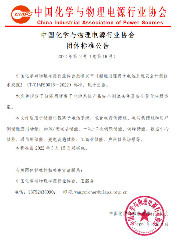 中國化學(xué)與物理電源行業(yè)協(xié)會批準(zhǔn)發(fā)布《儲能用鋰離子電池系統(tǒng)安全評測技術(shù)規(guī)范》(T/CIAPS0016―2022)標(biāo)準(zhǔn),現(xiàn)予公告。