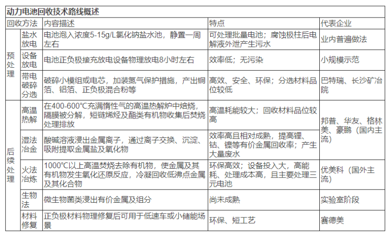 再生利用可分為預(yù)處理和后續(xù)處理。預(yù)處理工藝分為放電拆解和帶電破碎,再分選出銅箔、鋁箔、黑粉、外殼、隔膜等材料。后續(xù)處理包括高溫?zé)峤?、濕法冶金、火法冶煉、材料修?fù)等。