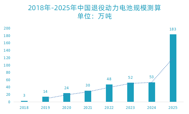 根據(jù)新能源汽車年裝機(jī)量,按120wh/kg電池能量密度,使用4年后退役回收,粗算退役電池規(guī)模。2020年約有24萬噸動(dòng)力電池退役。