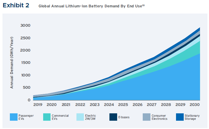 根據(jù)RMI公司的研究和彭博新能源財(cái)經(jīng)公司的分析,到2030年,全球?qū)︿囯x子電池的需求預(yù)計(jì)將達(dá)到每年2.8TW。其中大部分將滿(mǎn)足電動(dòng)汽車(chē)需求。