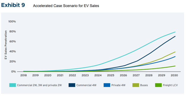 根據(jù)“加速情景”, 到2030年,電動(dòng)汽車(chē)在新車(chē)銷(xiāo)售中的細(xì)分市場(chǎng)滲透率將達(dá)到私家車(chē)的30%、商用車(chē)的70%、公交車(chē)的40%以及兩輪和三輪車(chē)的80%。在“保守情景”中,預(yù)計(jì)2030年電動(dòng)汽車(chē)在所有汽車(chē)細(xì)分市場(chǎng)的新銷(xiāo)量中的加權(quán)平均滲透率為35%。