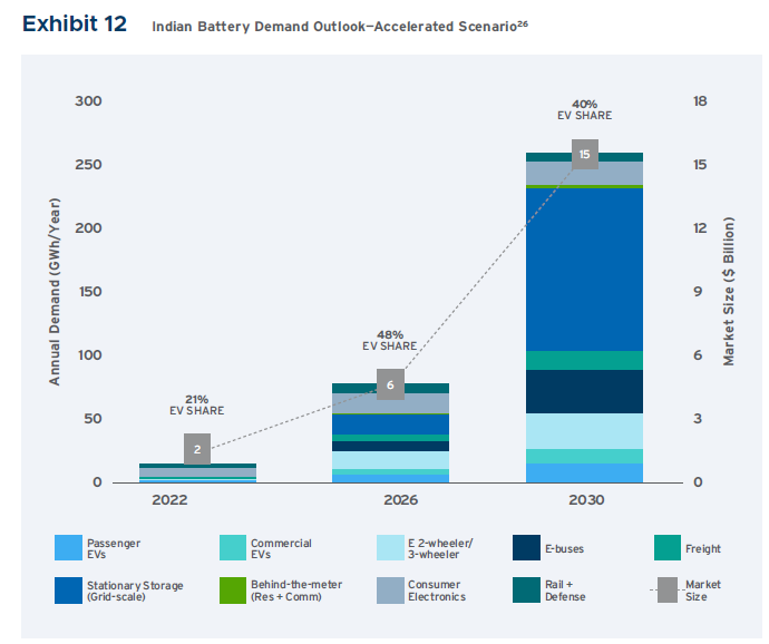中國(guó)儲(chǔ)能網(wǎng)訊:據(jù)外媒報(bào)道,印度國(guó)家研究院(NITI Aayog)與美國(guó)落基山研究所(RMI) 最近聯(lián)合發(fā)布了一份研究報(bào)告,該報(bào)告估計(jì)了印度在“加速情景”和“保守情景”下對(duì)電池產(chǎn)品的未來(lái)需求,以幫助滿(mǎn)足不斷增長(zhǎng)的電動(dòng)汽車(chē)數(shù)量、重要的電網(wǎng)儲(chǔ)能需求,并為印度的能源安全做出貢獻(xiàn)。