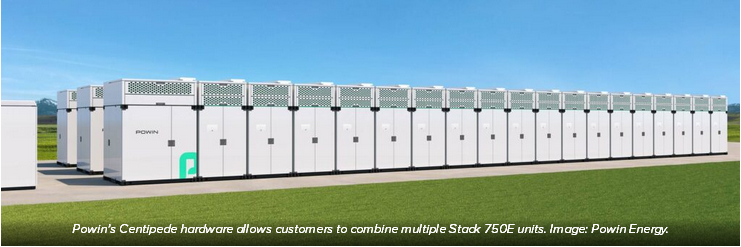 Powin Energy公司的Centipede電池儲(chǔ)能系統(tǒng)允許客戶(hù)組合多個(gè)Stack 750E儲(chǔ)能單元。