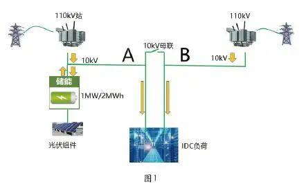 2.架構(gòu)規(guī)劃:本項(xiàng)目?jī)?chǔ)能容量規(guī)模為1MW/2MWh,蓄電池在集裝箱式儲(chǔ)能站集中布置,通過逆變、升壓后,通過新增的10kV環(huán)網(wǎng)柜,接入數(shù)據(jù)中心園區(qū)用戶側(cè)10kV母線。其中PCS(儲(chǔ)能變流器)是儲(chǔ)能系統(tǒng)中的核心設(shè)備,將蓄電池簇的直流電逆變?yōu)槿嗾医涣麟?輸出符合電網(wǎng)要求的電能,通過母排與升壓變壓器連接,在儲(chǔ)能站就地升壓為10kV。在園區(qū)10kV進(jìn)線處安裝逆功率保護(hù)器防止向電網(wǎng)側(cè)反向供電(見圖1)。