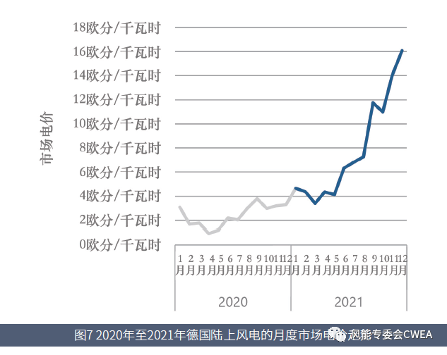 2020年,受新冠肺炎疫情影響,德國(guó)電力交易所的陸上風(fēng)電月度市場(chǎng)電價(jià)大幅下降。2021年上半年的電價(jià)水平與此基本持平,但下半年開(kāi)始迅速回升,至12月更是創(chuàng)下歷史新高,達(dá)到16歐分/千瓦時(shí)(約合人民幣1.14元/千瓦時(shí))。全年,德國(guó)陸上風(fēng)電的成交量加權(quán)平均月度市場(chǎng)電價(jià)(volume-weighted average monthly market value)為7.85歐分/千瓦時(shí),較2020年暴漲229%。CWEA