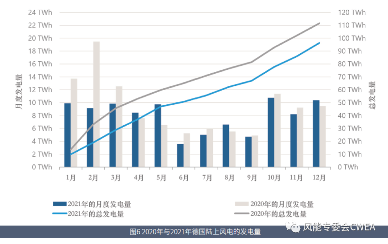圖6 2020年與2021年德國(guó)陸上風(fēng)電的發(fā)電量