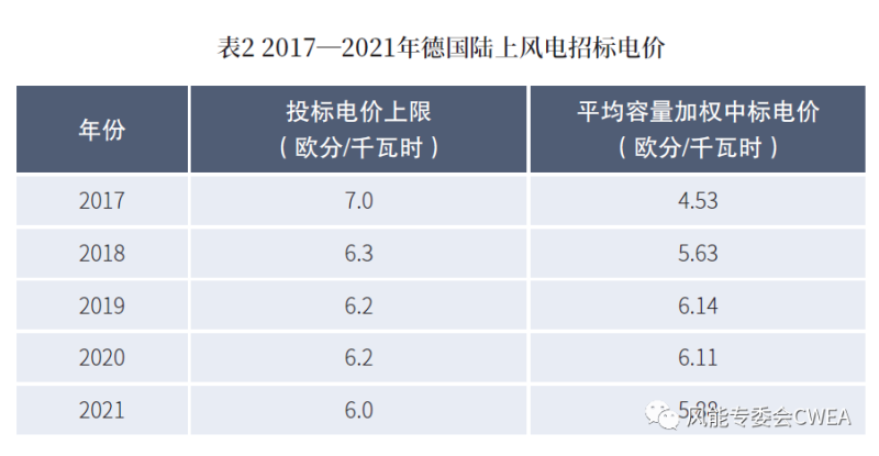 表2 2017—2021年德國(guó)陸上風(fēng)電招標(biāo)電價(jià)