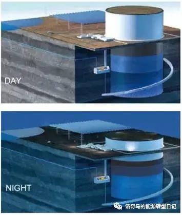 用圓柱體的巖石嵌放在形狀相同的儲(chǔ)水池中,白天有光伏發(fā)電富余電力時(shí),泵會(huì)把水壓入儲(chǔ)水池中,巖石活塞就會(huì)被水壓提起,即電能轉(zhuǎn)化成了重力勢(shì)能。而當(dāng)夜晚無(wú)光伏發(fā)電、電網(wǎng)需要電能供應(yīng)時(shí),閘門(mén)會(huì)打開(kāi)、巖石活塞下降,擠壓儲(chǔ)水池中的水流經(jīng)泵來(lái)發(fā)電,此時(shí)重力勢(shì)能會(huì)轉(zhuǎn)化成電能。