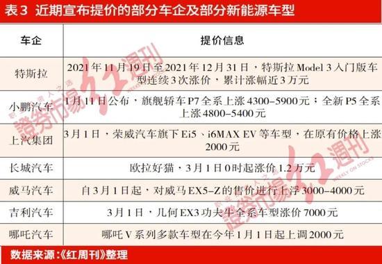 據(jù)《紅周刊》記者不完全統(tǒng)計,自去年12月以來,已有特斯拉、比亞迪、廣汽集團、上汽集團、長城汽車、小鵬、零跑等約20家車企宣布上調其旗下新能源汽車銷售價格,漲價金額多在數(shù)千元至數(shù)萬元不等(見表3)。