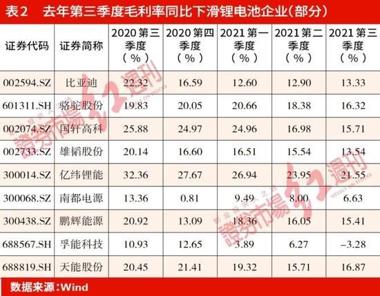 國內某鋰電池企業(yè)相關負責人向《紅周刊》記者表示,去年,包括鋰電池原材料在內的綜合成本增加了40%。事實上,自去年下半年以來,鋰電材料漲價因素對鋰電池企業(yè)的業(yè)績、毛利的影響已經開始加劇,這從去年鋰電池企業(yè)三季度的毛利數(shù)據(jù)可以很直觀地看到。如億緯鋰能,毛利率由2020年第三季度的32.36%下降至去年第三季度的21.55%,降幅為33%;國軒高科則由25.88%下降至15.71%,降幅為39%;孚能科技則由10.93%變?yōu)樨撝担ㄒ姳?)。