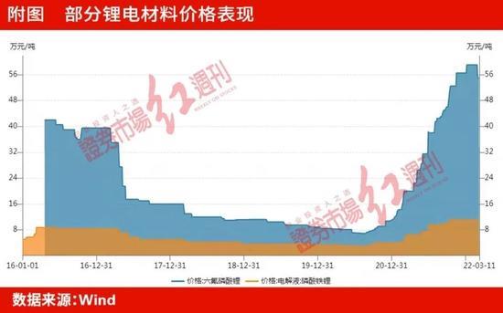 據(jù)Wind數(shù)據(jù)顯示,截至3月10日,如碳酸鋰(磷酸鐵鋰電池正極材料原料)報收50.1萬元/噸,相較于今年初27.8萬元/噸(1月4日報價)上漲80%,相較于去年同期漲幅達5倍;電解液核心原材料六氟磷酸鋰報價55萬元/噸,同比上漲達2.33倍;磷酸鐵鋰電池電解液價格報收11.03萬元/噸,同比上漲162%(見附圖)。