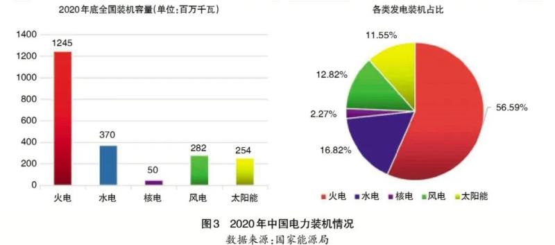 我國的能源生產(chǎn)結(jié)構(gòu)中煤炭占比是世界平均水平的3倍左右,石油占比不到世界平均水平的50%,天然氣占比不到全球的1/3。未來,可再生能源特別是新能源將被大規(guī)模開發(fā)利用,逐步取代傳統(tǒng)化石能源在能源體系中的主導(dǎo)地位。2020年,中國發(fā)電裝機(jī)達(dá)到22億千瓦,發(fā)電裝機(jī)以火電為主,占比達(dá)到56.59%,風(fēng)電、太陽能裝機(jī)分別占比12.82%和11.55%。但在全年發(fā)電量中,火電占比達(dá)到70%,風(fēng)電和太陽能以24%的裝機(jī)容量僅提供了不到10%的發(fā)電量,火電作為基礎(chǔ)電源的地位短期不會改變。在推進(jìn)碳達(dá)峰、碳中和進(jìn)程中,必須統(tǒng)籌好安全與發(fā)展、發(fā)展與減排之間的關(guān)系,協(xié)調(diào)好保障國家能源安全和履行碳減排職責(zé)之間的關(guān)系(見圖3)。
