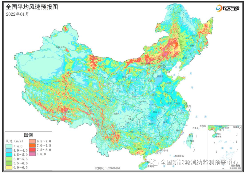 附圖1 全國(guó)2022年1月平均風(fēng)速分布預(yù)報(bào)圖