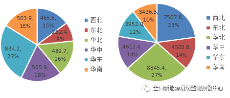 四季度各區(qū)域新增(左)、累計(jì)(右)并網(wǎng)風(fēng)電裝機(jī)(萬(wàn)千瓦)