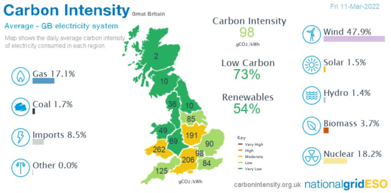 這一天,可再生能源發(fā)電占比達(dá)到54%,發(fā)電的碳排放強(qiáng)度為98克/千瓦時(shí)。