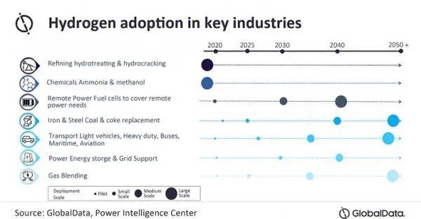 氫氣作為一種低碳或零碳能源正變得越來越受歡迎。綠色氫的主要增長市場包括綠色氫取代灰色氫,以及儲(chǔ)能、建筑和交通運(yùn)輸?shù)刃率袌?圖表由GlobalData提供)