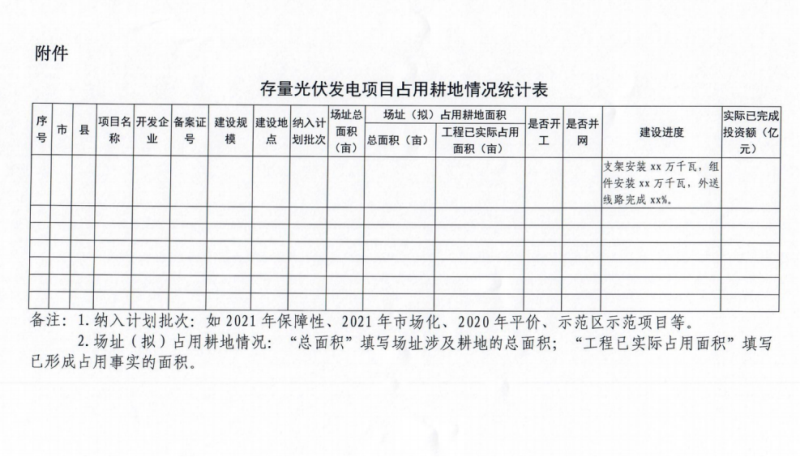 中國(guó)儲(chǔ)能網(wǎng)訊:3月11日,河北省能源局啟動(dòng)存量光伏電站占用耕地摸底統(tǒng)計(jì)工作,文件要求對(duì)照自然資源部門(mén)土地年度變更調(diào)查數(shù)據(jù)庫(kù),對(duì)已列入省年度計(jì)劃、尚未辦理建設(shè)用地審批手續(xù)的存量光伏發(fā)電項(xiàng)目占用耕地情況進(jìn)行摸底統(tǒng)計(jì)。附表信息統(tǒng)計(jì)中包括項(xiàng)目名稱(chēng)、開(kāi)發(fā)企業(yè)、備案證號(hào)、建設(shè)規(guī)模及地點(diǎn)、納入計(jì)劃批次以及場(chǎng)址總面積、已占用面積以及建設(shè)進(jìn)度等多項(xiàng)詳細(xì)信息。