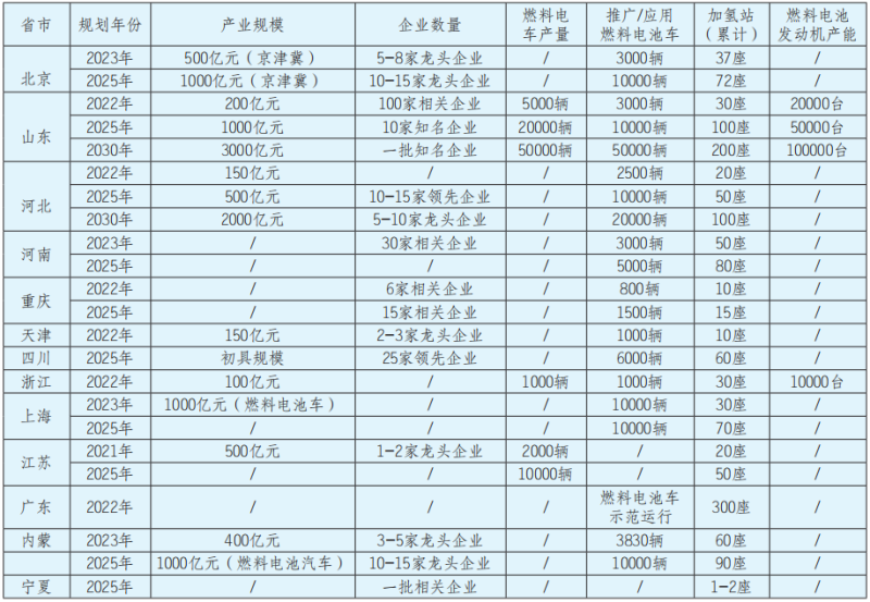 從主要省市區(qū)氫能產(chǎn)業(yè)發(fā)展規(guī)劃所制定的目標可以清晰地看出,燃料電池汽車及其產(chǎn)業(yè)鏈是各地發(fā)展氫能的主因,甚至是唯一選擇。表1中列舉的13個省市自治區(qū)中,除了寧夏以外,其余省市自治區(qū)的氫能產(chǎn)業(yè)規(guī)劃都具體為氫燃料電池汽車的生產(chǎn)或推廣目標,其中還有兩個省(山東和浙江)規(guī)劃了氫燃料電池發(fā)動機產(chǎn)能目標。對于氫能在其他領(lǐng)域的應(yīng)用則沒有涉及。