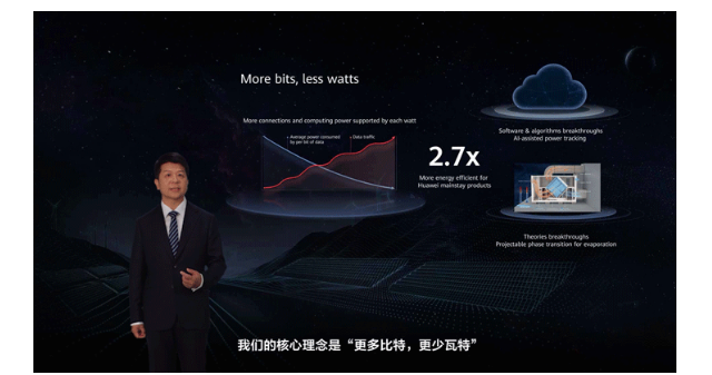 中國儲能網(wǎng)訊:近日,華為公司輪值董事長郭平,在巴塞羅那MWC峰會上提出:要保持數(shù)字經(jīng)濟的長期活力,必須加強碳減排的力度。More bits,less watts,華為要通過理論、材料、算法等的創(chuàng)新突破,實現(xiàn)每一個瓦特支撐更多的連接和計算。