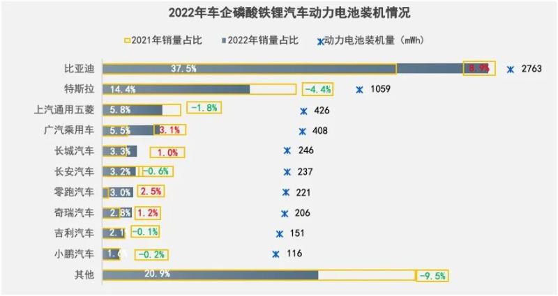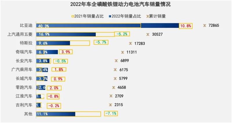 來(lái)到磷酸鐵鋰動(dòng)力電池車(chē)型市場(chǎng),2021年1月,搭載磷酸鐵鋰動(dòng)力電池的新能源汽車(chē)銷(xiāo)量是180,671輛,同比增長(zhǎng)221%,裝機(jī)量7,374mWh,同比增長(zhǎng)183.4%。1月TOP10車(chē)企銷(xiāo)量占比88.9%,比2021年提升7.1%,市場(chǎng)集中度非常高;磷酸鐵鋰動(dòng)力動(dòng)力電池裝機(jī)方面,TOP車(chē)企車(chē)型磷酸鐵鋰裝機(jī)量占比也高達(dá)79.1%,比2021年提升了9.5%。