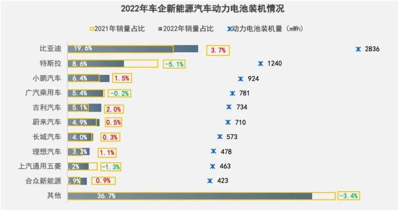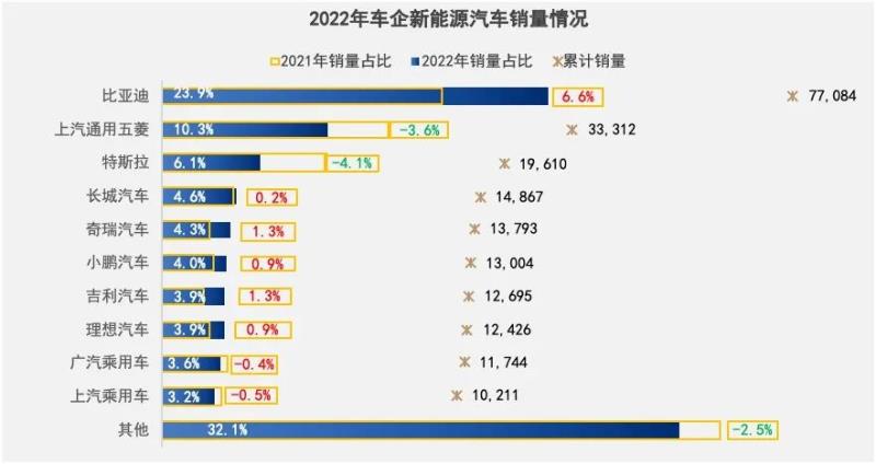 TOP10車(chē)企中,比亞迪月銷(xiāo)77,081輛,登頂冠軍寶座,市場(chǎng)占有率高達(dá)23.9%,比2021年增加6.6%;其次是上汽通用五菱,月售33,312輛,占比10.3%,市場(chǎng)份額下降3.6%;特斯拉排名第3,國(guó)內(nèi)售出19,610輛,占比6.1%,份額下滑了4.1%,由于出口業(yè)務(wù),特斯拉在國(guó)內(nèi)的交付量一直不穩(wěn)定。