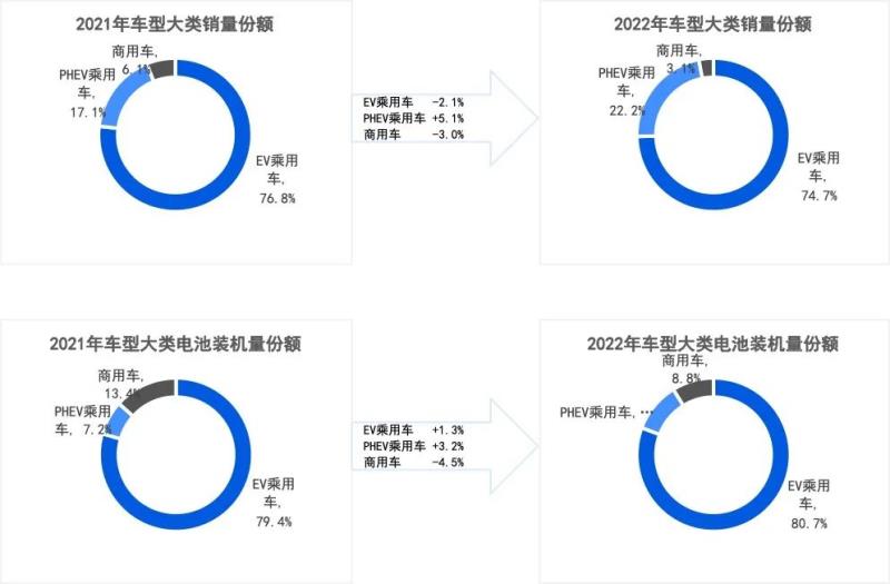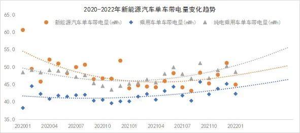 不管從什么層級(jí)看,2021年單車(chē)帶電量均呈現(xiàn)上升趨勢(shì),最主要的原因在于動(dòng)力電池性能提升。也是在2021年,純電乘用車(chē)平均單車(chē)帶電量反超新能源乘用車(chē)平均單車(chē)帶電量,究其原因還是因?yàn)樾履茉瓷逃密?chē)銷(xiāo)量份額的進(jìn)一步。