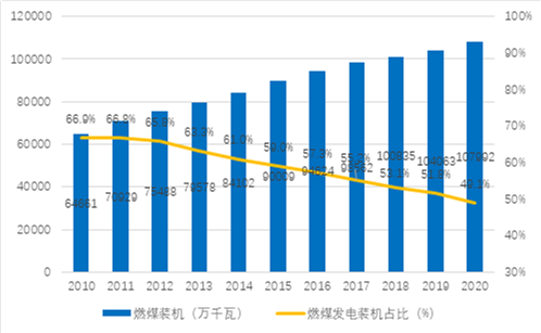 圖1 2010至2020年全國煤電裝機(jī)及占比情況