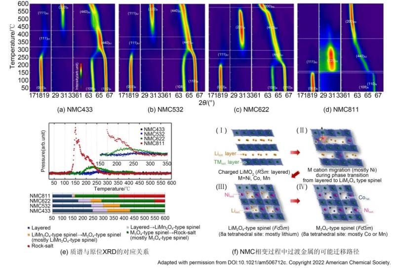 電池材料在升溫過程中發(fā)生相變和化學反應,其形貌、結構、成分和元素價態(tài)都有可能發(fā)生變化,這些變化需要基于對應的方法進行表征分析,如利用掃描電子顯微鏡觀察材料熱分解前后的形貌變化,利用X射線衍射和光譜學研究材料結構和元素價態(tài)演變。由于材料熱分解和熱反應存在顯著的動力學效應,在加熱過程中原位測試可以最大程度地還原物相變化的真實過程。目前較為成熟的原位表征技術主要有兩類:一類是與熱分析儀器串聯(lián)使用的質譜、紅外光譜等,可以實時監(jiān)測物質分解產生的氣體類型,判斷材料加熱過程中化學組成的變化;另一類是原位X射線衍射技術,通過特制的樣品臺,可以在升溫過程中實時、原位測定材料的結構變化,目前全球多數(shù)同步輻射光源和一些實驗室級的X射線衍射儀上都可以實現(xiàn)原位變溫XRD測試。Nam等利用變溫XRD發(fā)現(xiàn)脫鋰態(tài)LiNi1/3Co1/3Mn1/3O2結構在350 ℃向尖晶石轉變,而加入電解液后該轉變溫度會下降至304 ℃。Yoon等在LiNi0.8Co0.2O2中發(fā)現(xiàn)了類似的規(guī)律,并發(fā)現(xiàn)MgO包覆可以改善脫鋰態(tài)正極在電解液中的相變。圖5展示了變溫XRD和MS的聯(lián)用技術,系統(tǒng)研究了不同Ni含量的脫鋰態(tài)NCM三元正極在升溫過程中的結構和成分變化,研究發(fā)現(xiàn)三元正極失穩(wěn)釋放氧氣的過程與結構在高溫下轉化為尖晶石相的行為直接對應,且這一過程的起始溫度隨鎳含量的上升顯著下降,NCM523的起始相變溫度約為240 ℃,NCM811則小于150 ℃,從體相結構的本征變化解釋了高鎳正極在電池應用中熱安全性差的原因。以上工作都是基于同步輻射光源實現(xiàn)的,由于同步輻射提供的光源質量高、掃譜速度快,更適用于研究與時間相關的動力學問題。除此之外,近年來基于X射線譜學以及拉曼光譜實現(xiàn)同步表征的方法均有所發(fā)展。結合通過熱分析手段觀察得到的材料熱行為信息,并對升溫過程中材料物相變化的研究,可以更深刻地理解材料演變以及電池體系熱失穩(wěn)的動力學過程,為材料的安全性改良提供理論指導。
