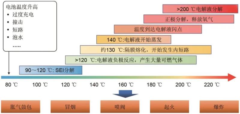 在鋰電池發(fā)展的早期階段,產業(yè)界和學術界更關注鋰電池發(fā)生安全性事故的本質原因,基于長期的認識積累,鋰電池發(fā)生安全事故的本質可以總結為:電池在過充、過熱、撞擊、短路等異常使用條件下溫度異常升高,引發(fā)內部一系列化學反應,引起電池脹氣、冒煙、安全閥打開,同時這些反應會大量釋放熱量使整個電池溫度進一步升高,最終各個化學反應劇烈發(fā)生,電池溫度不可控地迅速上升,引起燃燒或爆炸,導致嚴重的安全事故,這一過程也被稱為電池的“熱失控”。電池從異常升溫到熱失控過程中存在多個重要的化學反應,它們與溫度的對應關系如圖2所示。