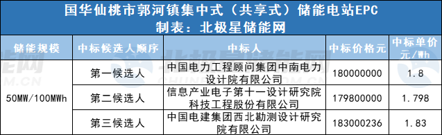 中國電力工程顧問集團中南電力設(shè)計院有限公司為第一中標候選人,中標價格1.8億元,儲能單價1.8元/Wh。信息產(chǎn)業(yè)電子第十一設(shè)計研究院科技工程股份有限公司為第二中標候選人,中標價格1.798億,儲能單價1.798元/Wh。中國電建集團西北勘測設(shè)計研究院有限公司為第三中標候選人,中標價格1.83000236億,中標單價1.83元/Wh。
