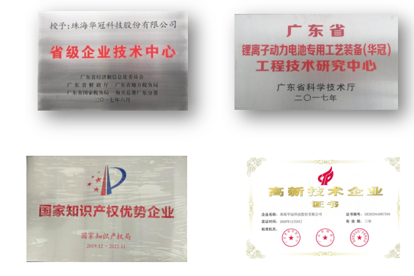 自2002年以來(lái),華冠科技被連續(xù)認(rèn)定為國(guó)家高新技術(shù)企業(yè),同時(shí)是“國(guó)家火炬計(jì)劃”承擔(dān)企業(yè)、“國(guó)家知識(shí)產(chǎn)權(quán)優(yōu)勢(shì)企業(yè)”“廣東省裝備制造100家重點(diǎn)培育企業(yè)”“廣東省守合同重信用企業(yè)”,在行業(yè)中率先被認(rèn)定為“AAAA”級(jí)標(biāo)準(zhǔn)化良好行為企業(yè)。公司研發(fā)中心被認(rèn)定為“廣東省鋰離子動(dòng)力電池專用工藝裝備(華冠)工程技術(shù)研究中心”“省級(jí)企業(yè)技術(shù)中心”“廣東省工程技術(shù)研究開發(fā)中心”。