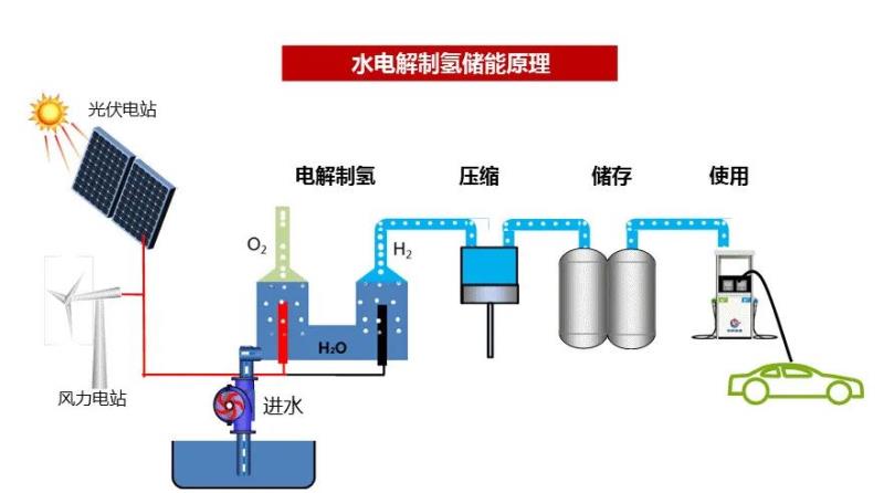 氫儲能技術(shù)是利用電力和氫能的互變性而發(fā)展起來的:利用電解制氫,將間歇波動、富余電能轉(zhuǎn)化為氫能儲存起來;在電力輸出不足時,利用氫氣通過燃料電池或其他發(fā)電裝置發(fā)電回饋至電網(wǎng)系統(tǒng)。可以說,氫儲能是一種以氫能為介質(zhì)實現(xiàn)可再生能源高效儲存及利用的技術(shù)方式與發(fā)展模式,原理如下:
