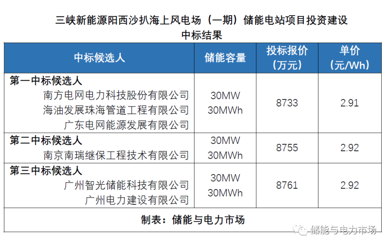 中國儲能網(wǎng)訊:近日,三峽新能源新能源陽西沙扒海上風(fēng)電場(一期)儲能電站項目發(fā)布投資建設(shè)中標(biāo)結(jié)果,南方電網(wǎng)科技股份有限公司/海油發(fā)展珠海管道工程有限公司/廣東電網(wǎng)能源發(fā)展有限公司組成的聯(lián)合體成為第一中標(biāo)候選人,投標(biāo)報價8733萬元,該項目儲能容量30MW/30MWh,中標(biāo)單價2.91元/Wh。