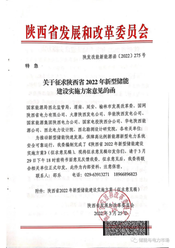 中國(guó)儲(chǔ)能網(wǎng)訊:3月25日,陜西省發(fā)改委發(fā)布了《陜西省2022年新型儲(chǔ)能建設(shè)實(shí)施方案(征求意見稿)》。明確了2022年陜西省主要圍繞陜湖直流一期配套以及2021年渭南新能源基地項(xiàng)目建設(shè),開展新型儲(chǔ)能項(xiàng)目示范,規(guī)劃建設(shè)約100萬千瓦(2小時(shí))新型儲(chǔ)能示范項(xiàng)目。