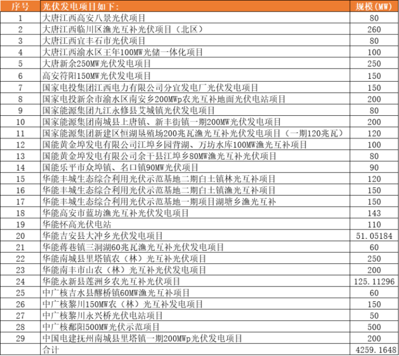 中國儲能網(wǎng)訊:近期,江西省發(fā)展改革委下達了2022年第一批省重點建設(shè)項目計劃的通知。據(jù)悉,2022年第一批省重點建設(shè)項目安排491項,總投資17071億元,年度計劃投資4165億元。其中,建成投產(chǎn)項目62項,續(xù)建項目228項,計劃新開工項目189項,預(yù)備項目12項。而重點建設(shè)光伏項目共29個,規(guī)模4259.1648MW。具體項目如下: