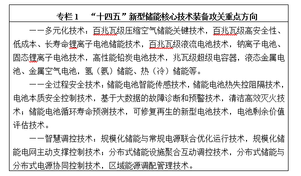 新型儲(chǔ)能關(guān)鍵技術(shù)研發(fā)是先決條件,在《實(shí)施方案》中,技術(shù)創(chuàng)新被提到前所未有的高度,在六大重大任務(wù)方向中排在首位,這六大任務(wù)方向包括:技術(shù)創(chuàng)新、試點(diǎn)示范、規(guī)模發(fā)展、體制機(jī)制、政策保障、國(guó)際合作?!秾?shí)施方案》強(qiáng)調(diào)對(duì)新型儲(chǔ)能技術(shù)創(chuàng)新要加強(qiáng)戰(zhàn)略性布局和系統(tǒng)性謀劃,專欄1中列出了“十四五”新型儲(chǔ)能核心技術(shù)裝備攻關(guān)重點(diǎn)方向,從推動(dòng)多元化技術(shù)開(kāi)發(fā)、突破全過(guò)程安全技術(shù)、創(chuàng)新智慧調(diào)控技術(shù)三個(gè)層面來(lái)部署,以集中技術(shù)攻關(guān),并提出研發(fā)的儲(chǔ)備技術(shù)方向,鼓勵(lì)不同技術(shù)路線“百花齊放”,同時(shí)兼顧創(chuàng)新資源的優(yōu)化配置。