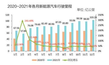 2021年,新能源汽車?yán)塾嬓旭偫锍淌状瓮黄?000億公里,這是一個里程碑式的數(shù)字。其中,12月單月的行駛里程達(dá)到103.28億公里,這也是新能源汽車單月行駛里程首次突破100億公里,同比增長46%,保持較高增速。