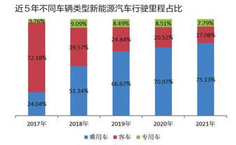 縱觀2017~2021年這5年不同類型新能源汽車行駛里程的變化,乘用車占比穩(wěn)步擴(kuò)大,從24.04%上升到75.13%;相對應(yīng)的,客車占比逐年下降,從72.18%降至17.08%;專用車占比相對穩(wěn)定。這主要是因為新能源汽車推廣早期,是以公共交通尤其是新能源公交車作為重點示范項目推廣,而包括公交車在內(nèi)的客車數(shù)量達(dá)到一定程度后,后續(xù)增長有限。之后,私人消費的潛力逐漸被激發(fā),越來越多的普通消費者選擇購買新能源乘用車。