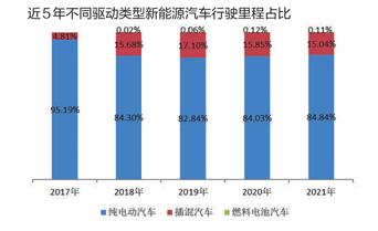 從驅(qū)動類型看,受國家政策導(dǎo)向影響,純電動汽車行駛里程占比在2017年高達(dá)95.19%,2018年開始下降,之后一直穩(wěn)定在84%左右。插電式混合動力車占比在2018年出現(xiàn)小幅攀升,之后一直穩(wěn)定在15%左右。