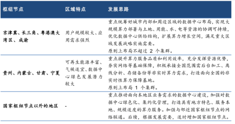 我國(guó)數(shù)據(jù)中心大多分布在東部地區(qū),由于土地、能源等資源日趨緊張,在東部大規(guī)模發(fā)展數(shù)據(jù)中心難以為繼。而西部地區(qū)資源充裕,特別是可再生能源豐富,具備發(fā)展數(shù)據(jù)中心、承接?xùn)|部算力需求的潛力。“東數(shù)西算”有利于推動(dòng)數(shù)據(jù)中心合理布局、優(yōu)化供需,提升國(guó)家整體算力水平,擴(kuò)大有效投資,推動(dòng)區(qū)域協(xié)調(diào)發(fā)展,具有多方面多層次重要意義。我國(guó)算力網(wǎng)絡(luò)各類(lèi)樞紐節(jié)點(diǎn)定位及發(fā)展思路見(jiàn)表3。本次“東數(shù)西算”的全面啟動(dòng),疊加數(shù)字經(jīng)濟(jì)確定的發(fā)展方向,對(duì)于整個(gè)數(shù)通側(cè)將是確定性大機(jī)會(huì),算力、流量持續(xù)高速增長(zhǎng)是必然趨勢(shì),配套基礎(chǔ)設(shè)施持續(xù)建設(shè)擴(kuò)容是剛性需求,未來(lái)3~5年具有高確定性。