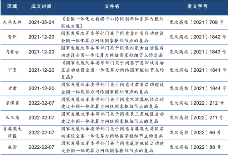 數(shù)字時(shí)代正在召喚一張高效率的“算力網(wǎng)”。“東數(shù)西算”是把東部密集的算力需求有序引導(dǎo)到西部,使數(shù)據(jù)要素跨域流動(dòng)。打通“數(shù)”動(dòng)脈,織就全國(guó)算力一張網(wǎng),既緩解了東部能源緊張的問(wèn)題,也為西部開(kāi)辟一條發(fā)展新路。與“東數(shù)西算”相關(guān)文件的主要政策文件見(jiàn)表2。